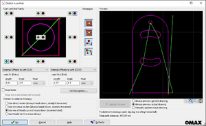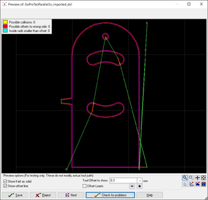 In the new window that appears check that the dashed pink line is on the correct side of the line - this indicates the kerf of the waterjet and should be on the inside of holes and outside the perimeter of your part.
